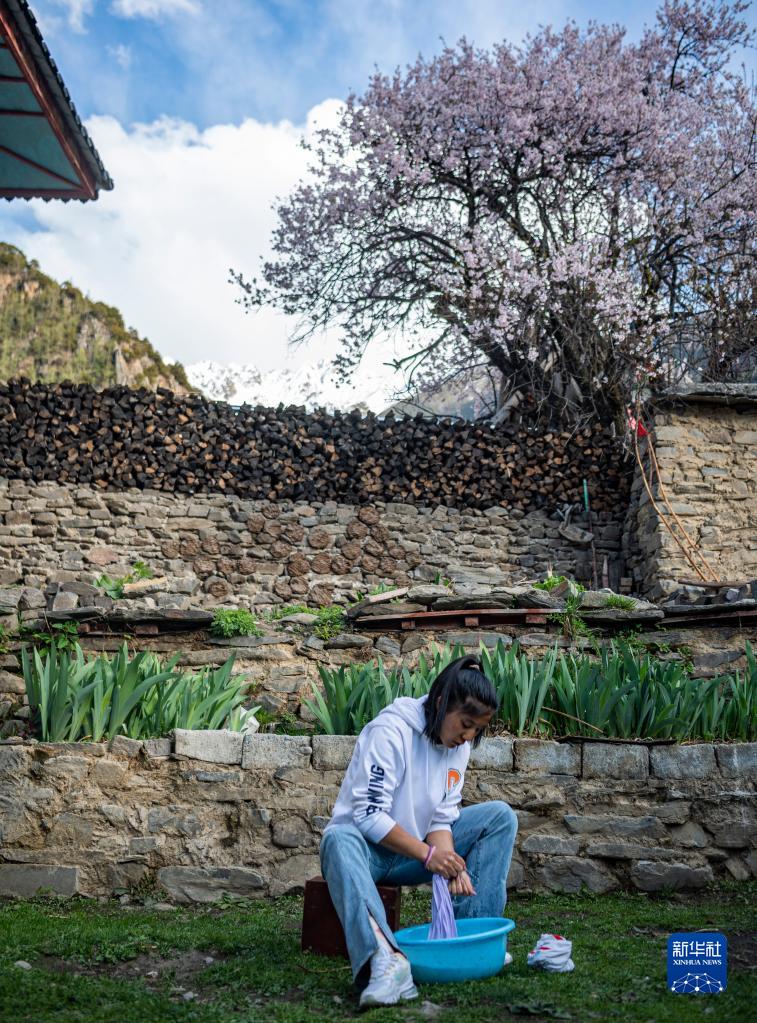 在位於(yu) 西藏林芝市工布江達縣仲莎鄉(xiang) 的家中,玉珍拉姆在院子裏洗衣服(4月24日攝)。新華社記者 孫非 攝