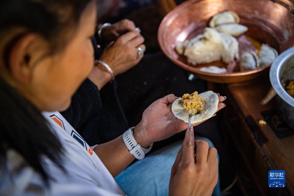 在位於(yu) 西藏林芝市工布江達縣仲莎鄉(xiang) 的家中,玉珍拉姆在做土豆包子(4月24日攝)。新華社記者 孫非 攝