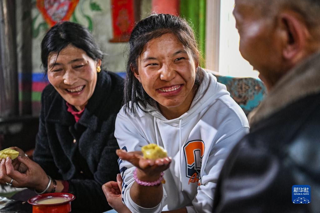在位於(yu) 西藏林芝市工布江達縣仲莎鄉(xiang) 的家中,玉珍拉姆(中)向爸爸展示自己做的土豆包子(4月24日攝)。新華社記者 孫非 攝