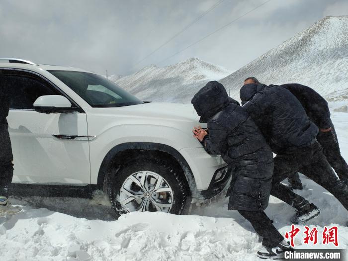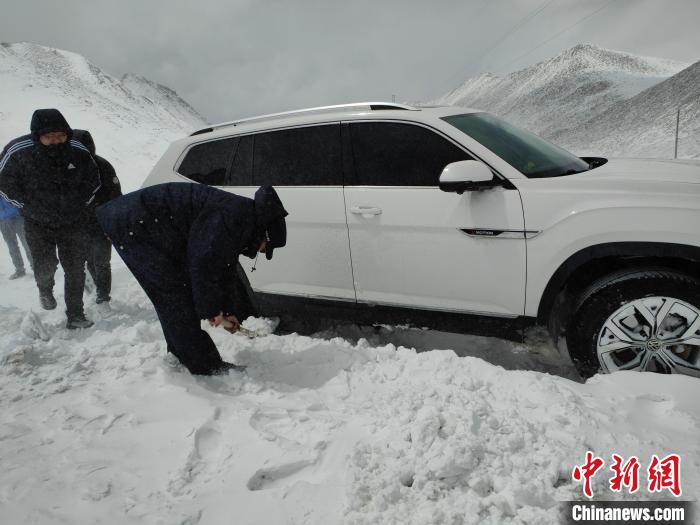 “看見你們(men) 過來,懸在我們(men) 所有人心裏的石頭就落地了。”接警一個(ge) 多小時後,民警終於(yu) 在海拔5800米的相拉山口處發現5輛被困車輛。根據現場情況,民警決(jue) 定采用掘進方式,為(wei) 車輛清理出一條道路。“大夥(huo) 兒(er) 來搭把手,人多力量大!”被困民眾(zhong) 配合民警使用鐵鍬將最前麵車輛周圍積雪鏟除,嚐試將車輛推出積雪路段。但因車輛自重、積雪太厚,救援人員無法推動車輛前移,第一次救援以失敗告終。