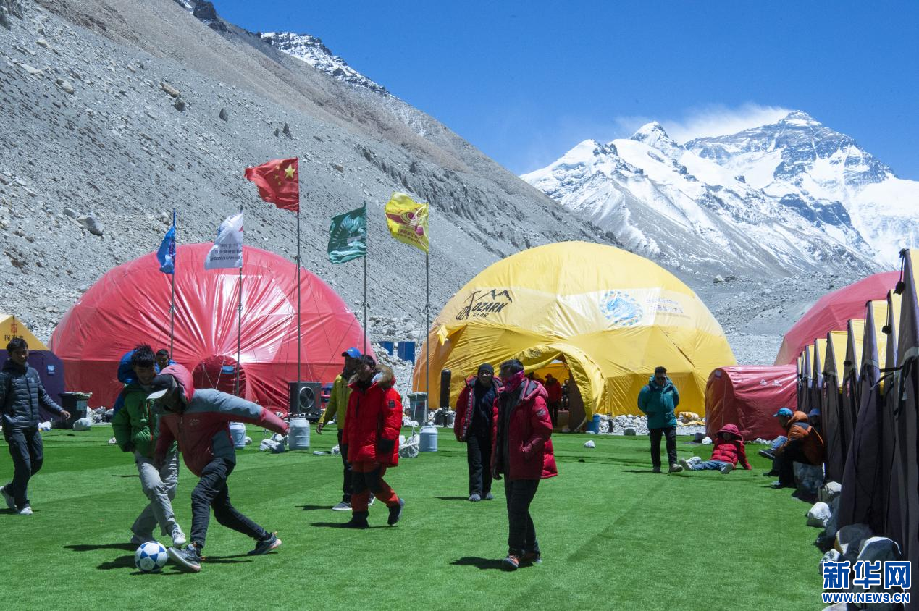 5月9日,登山隊員在珠峰大本營踢球。新華網 旦增努布 攝