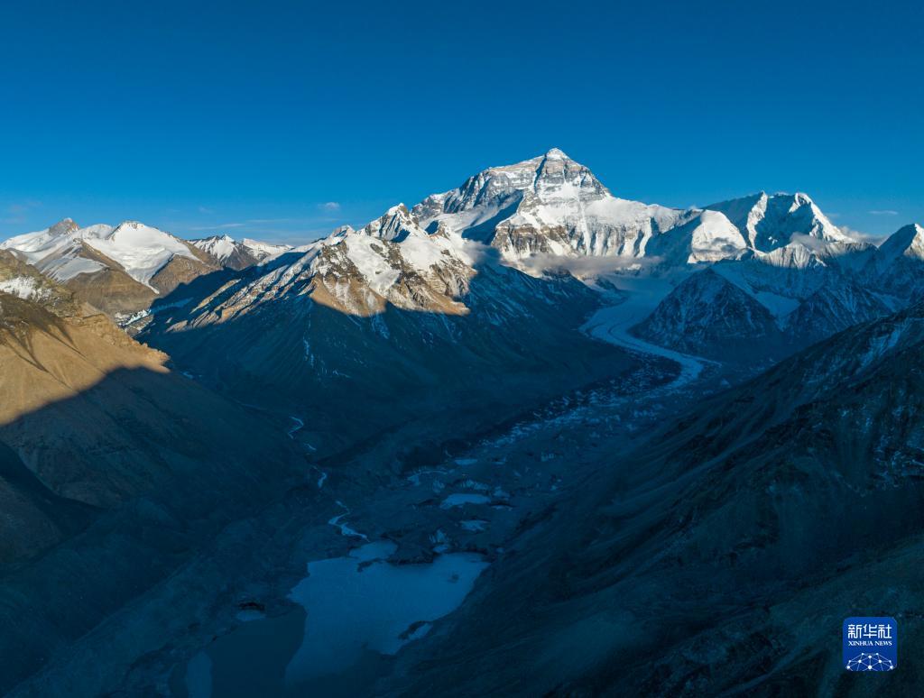 這是日落時分的珠峰和絨布冰川(5月16日攝,無人機照片)。新華社記者 晉美多吉 攝