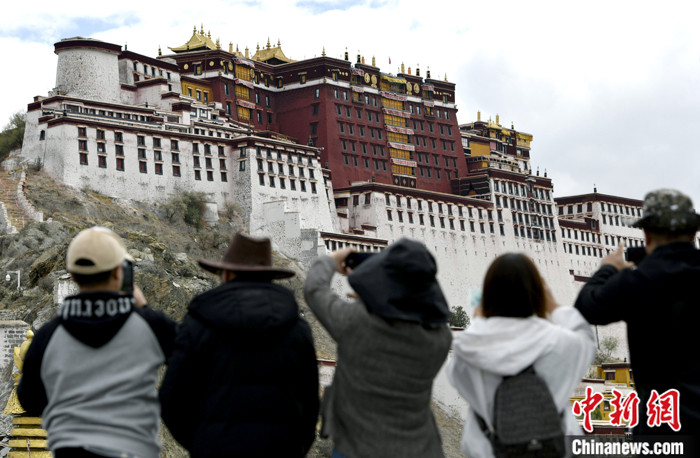 5月19日,遊客在西藏拉薩布達拉宮觀景台拍照留念。5月的拉薩初夏,草木漸茂、綠樹成蔭,雨量充沛、濕度適宜,日光充盈卻少了一絲(si) 燥熱,成為(wei) 了眾(zhong) 多遊客選擇進藏的最佳時節。 中新社記者 李林 攝