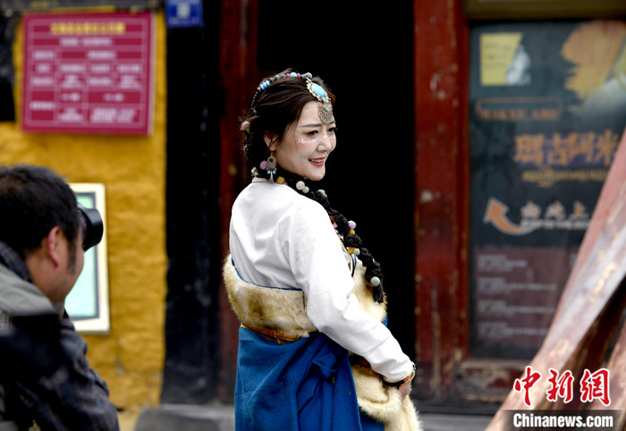 5月19日,遊客身著民族特色的服裝在拉薩八廓街拍照留念。5月的拉薩初夏,草木漸茂、綠樹成蔭,雨量充沛、濕度適宜,日光充盈卻少了一絲(si) 燥熱,成為(wei) 了眾(zhong) 多遊客選擇進藏的最佳時節。 中新社記者 李林 攝