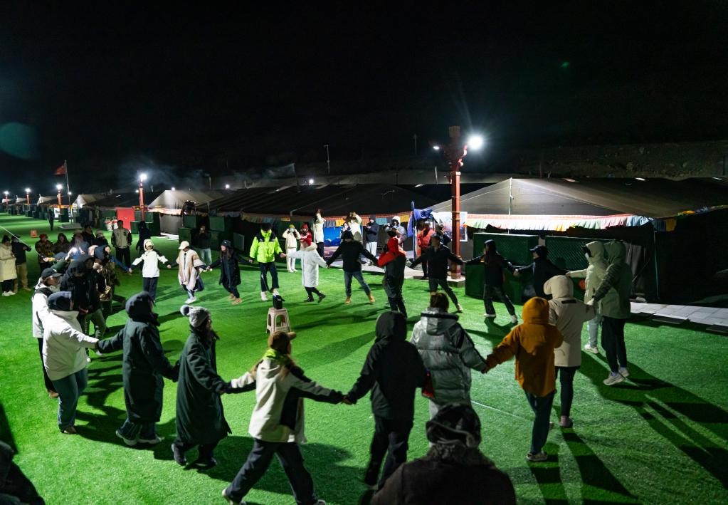 在珠峰遊客大本營,遊客們(men) 在帳篷旅館間的空地上唱歌跳舞(5月16日攝)。新華社記者孫非 攝