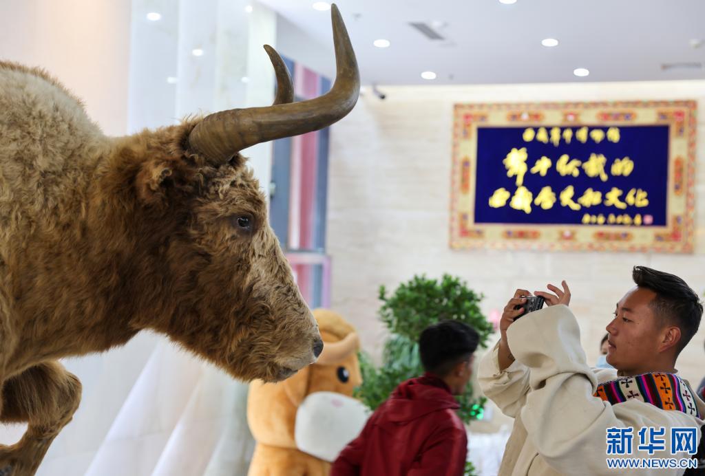 一名學生在西藏犛牛博物館拍攝展出的金絲(si) 野犛牛標本(5月18日攝)。新華社記者 薑帆 攝