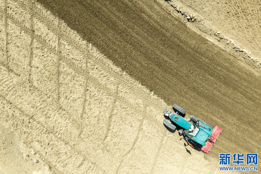 5月12日,西藏定日縣紮西宗鄉(xiang) 巴鬆村的村民在犁地(無人機照片)。 新華網 旦增努布 攝