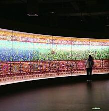 唐卡藏語意為(wei) “卷軸畫”,常見的唐卡作品長寬都在1米左右,這幅長618米的巨幅唐卡尺寸之大,實屬罕見。整幅作品由金銀、珊瑚、瑪瑙、珍珠、綠鬆石等純天然礦物配製的顏料繪製而成,上下裝飾的堆繡圖案達3000多種。藏文化博物院用四層整層對其進行了完整展示,蜿蜒曲折的展線讓人仿佛徜徉於(yu) 曆史長河。