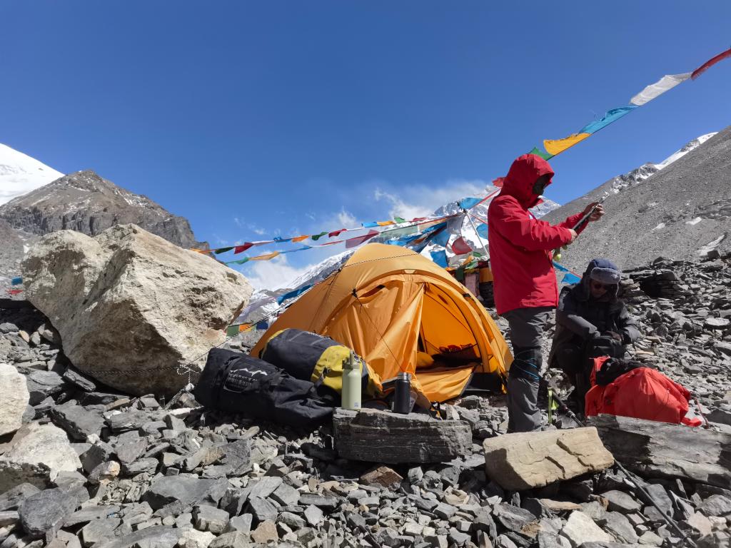 古生物科考分隊在珠峰開展野外科學考察活動,研究員蘇濤(左一)與(yu) 隊員在山中尋找避風處露營。采訪對象供圖。