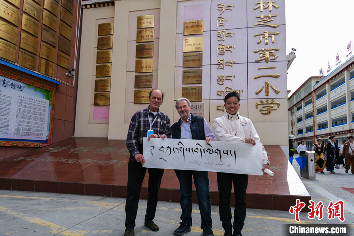 圖為(wei) 5月18日,柯馬凱(左一)在林芝市第二小學參訪時獲得學校贈予的藏文書(shu) 法作品“紮西德勒”。中新社記者 江飛波 攝