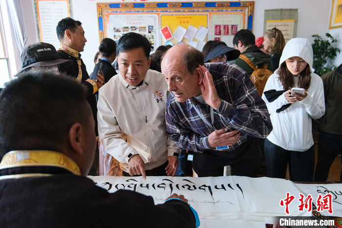 圖為(wei) 5月18日上午,參訪團成員柯馬凱(Michael Crook)側(ce) 耳傾(qing) 聽藏文書(shu) 法老師的講解。中新社記者 江飛波 攝