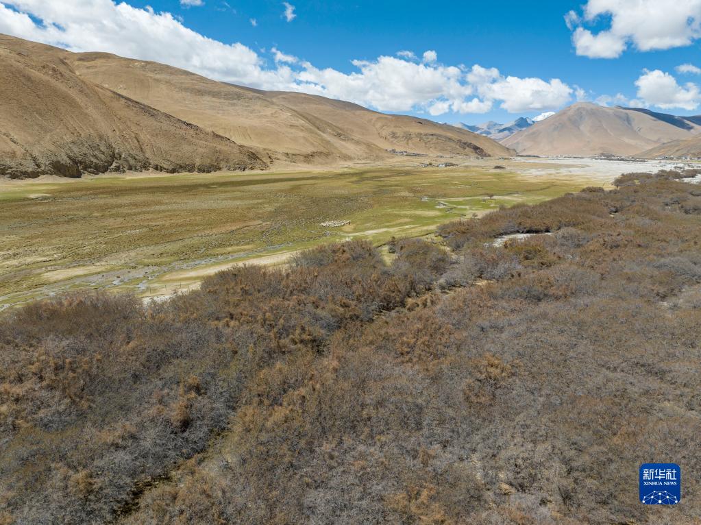 這是在珠峰國家級自然保護區內(nei) 拍攝的沙棘林和濕地(5月25日攝,無人機照片)。新華社記者 孫非 攝