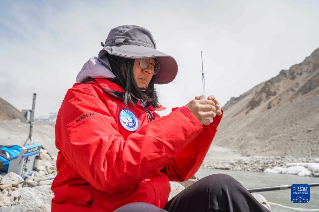 在珠峰登山大本營附近,來自中國科學院青藏高原研究所的科考隊員邱海英在檢測絨布冰川末端水質(5月14日攝)。新華社記者 孫非 攝