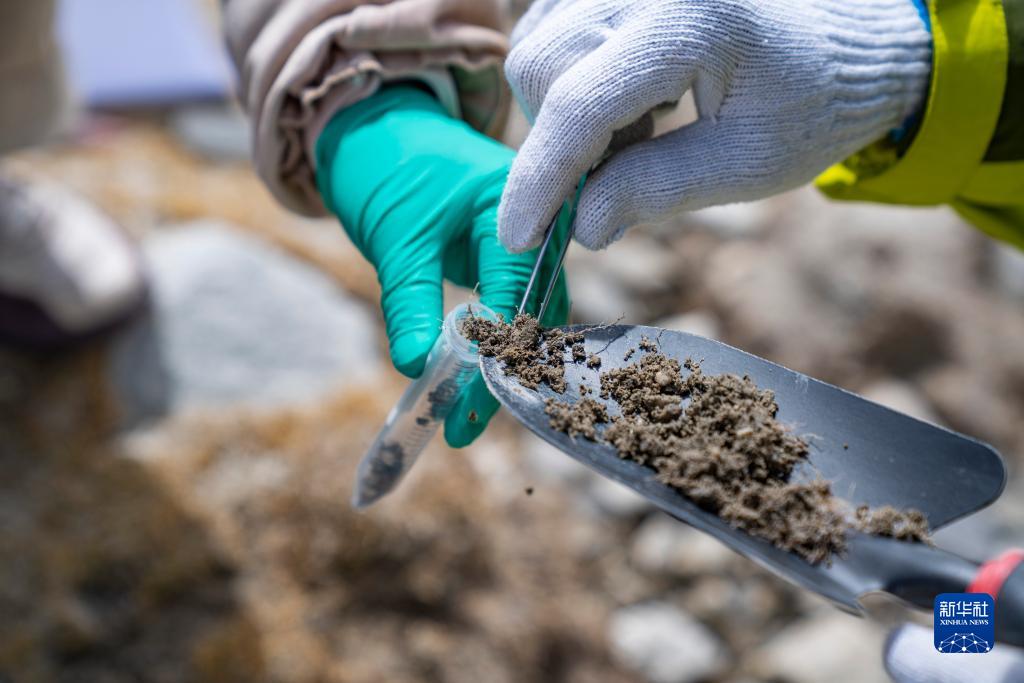 在珠峰登山大本營附近,來自西藏大學生態環境學院的科考隊員在收集土壤樣本(5月22日攝)。新華社記者 孫非 攝