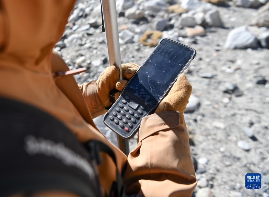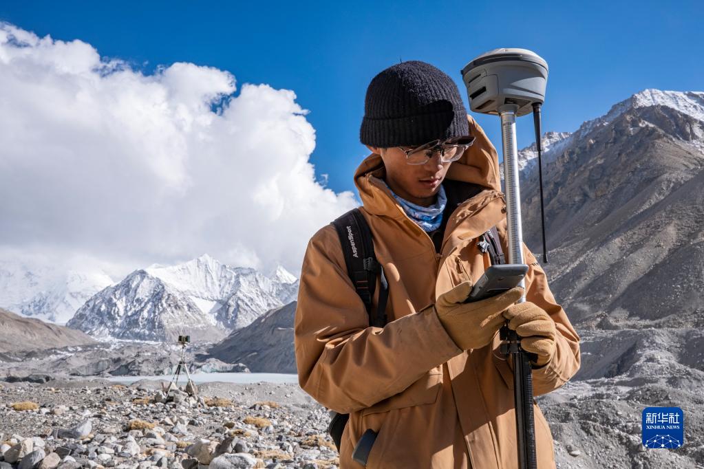 在珠峰海拔約5300米處,來自中國科學院西北生態環境資源研究院的科考隊員薛雨昂在對冰川進行實時差分GPS定位(5月15日攝)。新華社記者 晉美多吉 攝