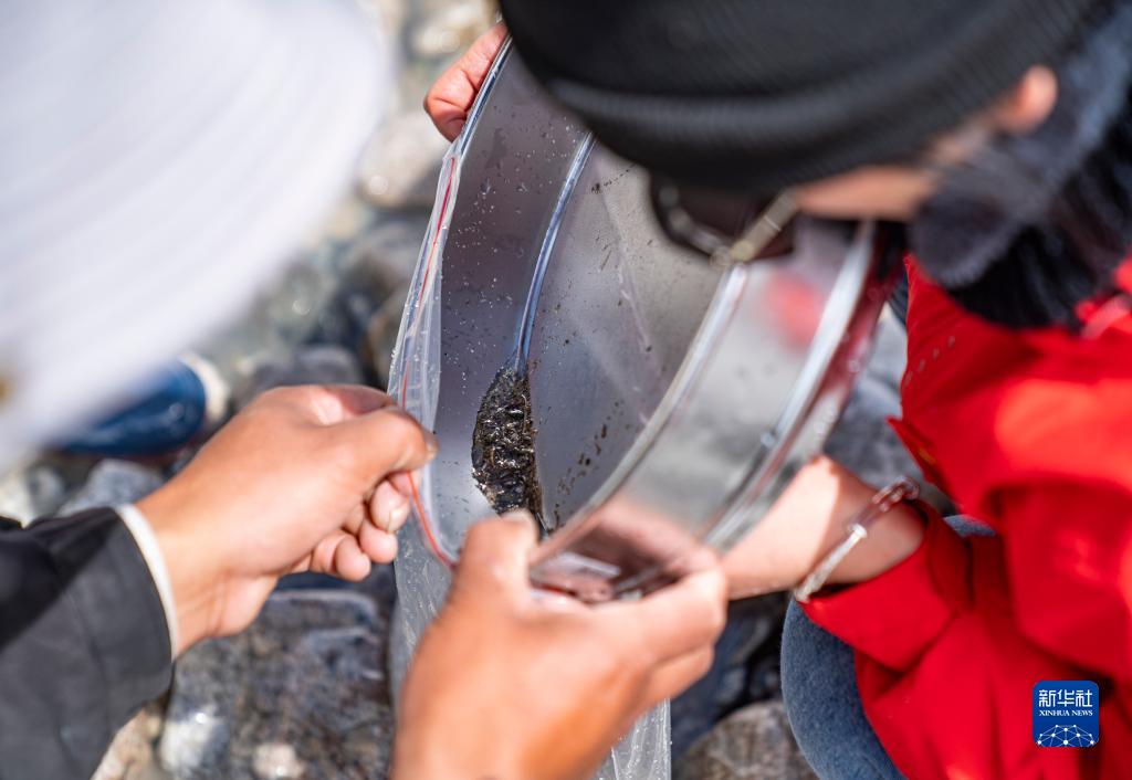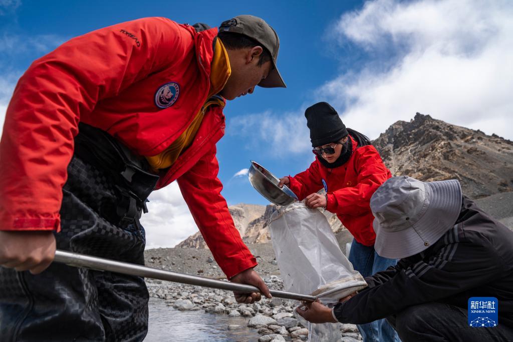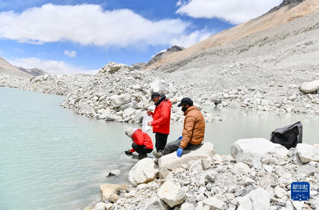 在珠峰登山大本營附近,來自西藏大學生態環境學院的科考隊員在采集水生生物樣本(5月22日攝)。新華社記者 孫非 攝