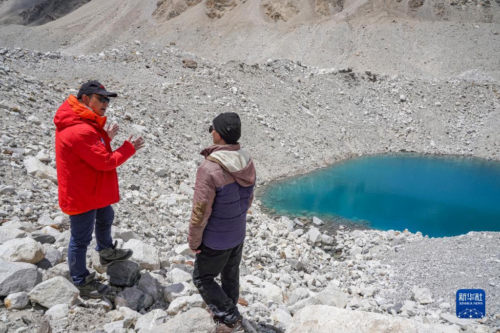 在珠峰海拔約5300米處,中國科學院西北生態環境資源研究院副院長康世昌(左)和科考隊員討論冰麵湖的形成原因(5月14日攝)。新華社記者 孫非 攝
