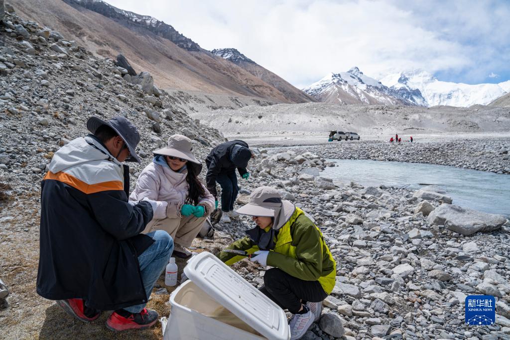 在珠峰登山大本營附近,來自西藏大學生態環境學院的科考隊員在進行水生態調查(5月22日攝)。新華社記者 孫非 攝