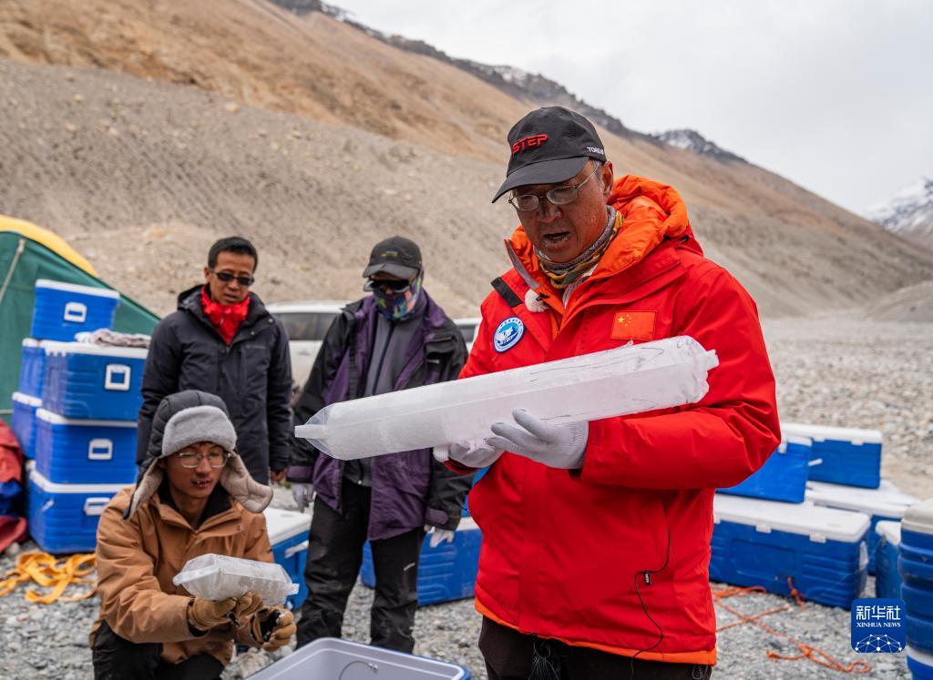 在珠峰登山大本營,中國科學院西北生態環境資源研究院副院長康世昌(右)在查看從(cong) 珠峰海拔約6500米處鑽取的冰芯樣品(5月22日攝)。新華社記者 孫非 攝