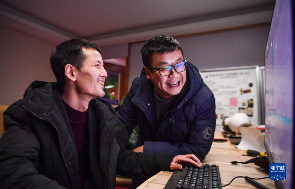 尤顯龍(左)和同事唐鵬在討論觀測到的數據(5月23日攝)。新華社記者 晉美多吉 攝