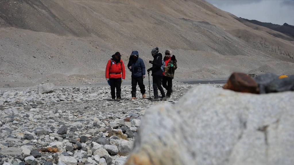 在海拔5200米的登山大本營附近的絨布河進行完檢測後,科考人員一行計劃前往約三公裏外的中絨布冰川末端的冰湖,采集冰川融水樣本並檢測水質。