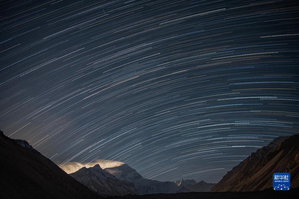 這是5月10日淩晨在珠峰大本營拍攝的星軌(合成照片)。新華社記者 孫非 攝