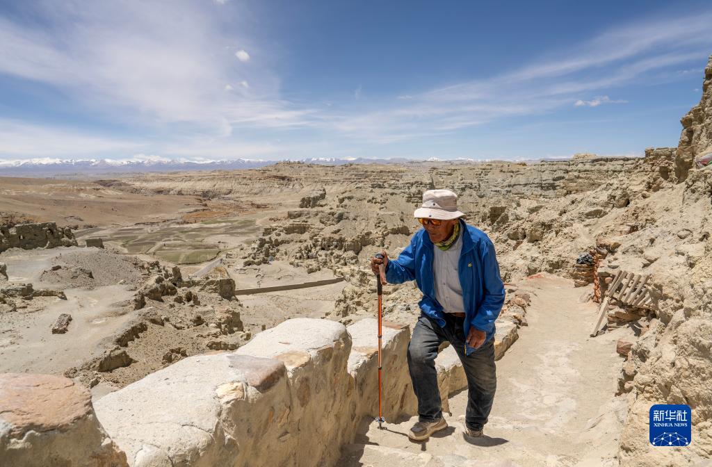 5月26日,仁增旺紮老人拄著拐棍在石窟間行走。新華社記者 費茂華 攝