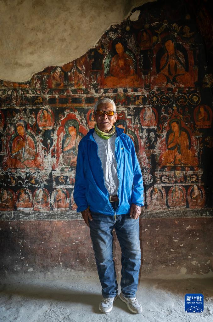 5月26日,仁增旺紮老人在皮央石窟的壁畫前留影。新華社記者 費茂華 攝