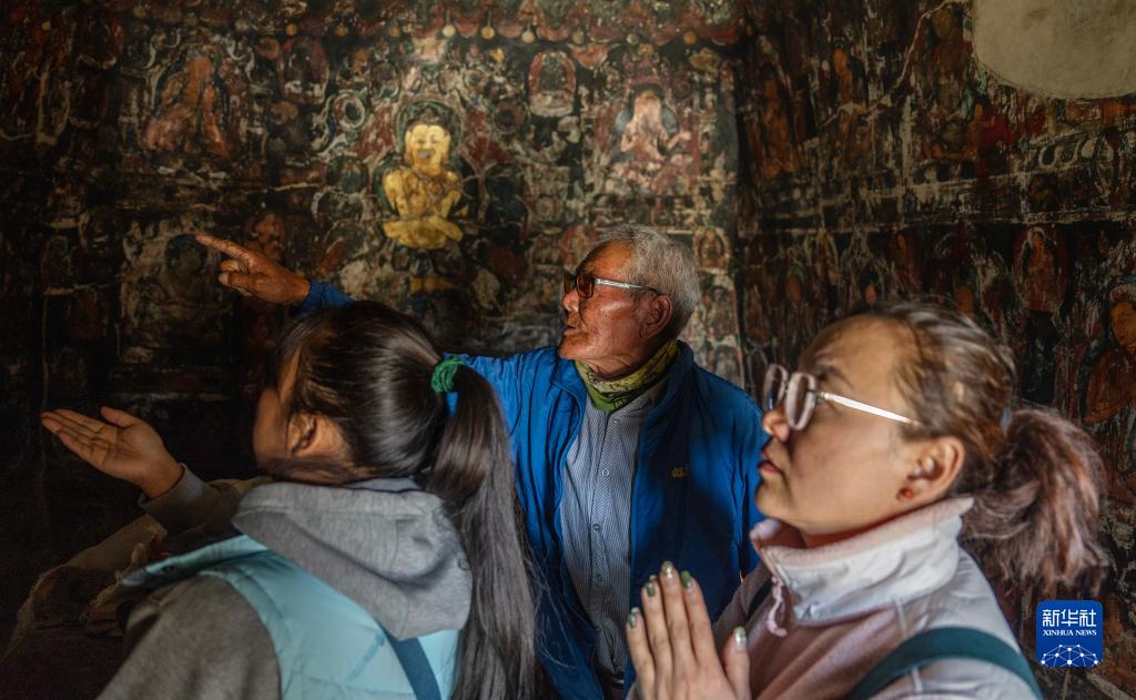 5月26日,仁增旺紮老人(中)在為(wei) 遊客介紹壁畫。新華社記者 費茂華 攝