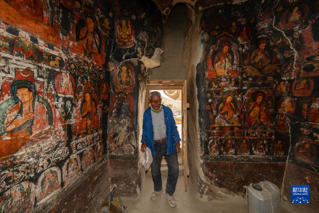 5月26日,仁增旺紮老人走進繪滿壁畫的石窟。新華社記者 費茂華 攝