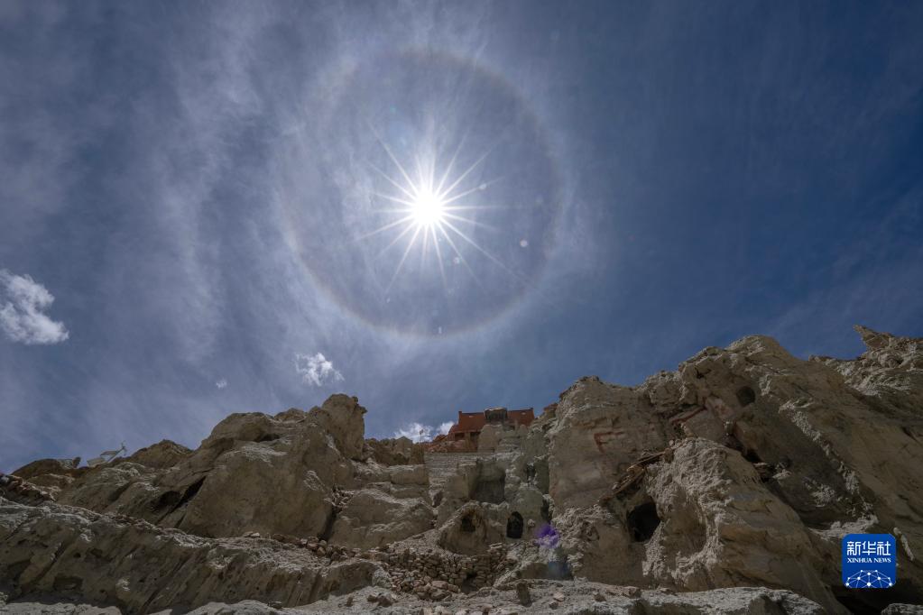 5月26日,日暈出現在皮央石窟群所在的小山上空。新華社記者 費茂華 攝