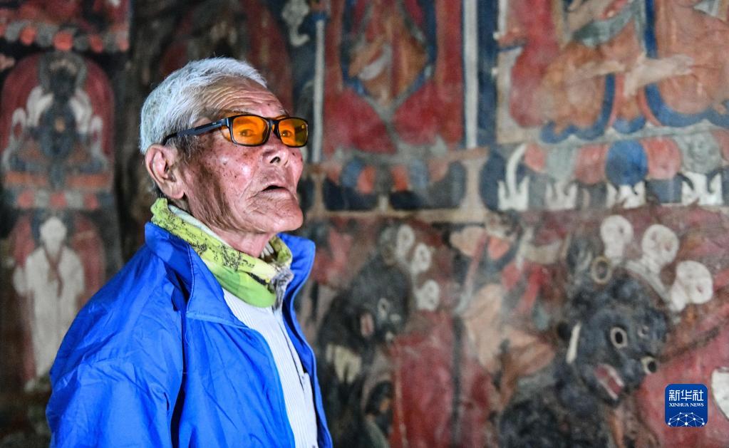 仁增旺紮老人查看壁畫(5月26日攝)。新華社記者 晉美多吉 攝