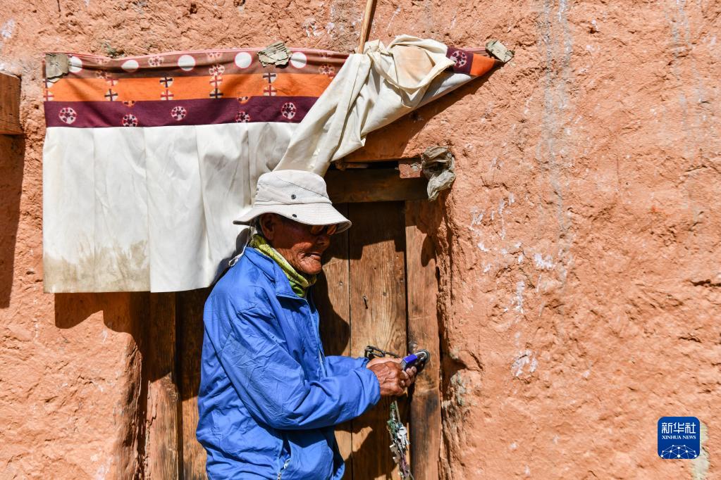 仁增旺紮老人打開其中一間還留存有壁畫的石窟大門(5月26日攝)。新華社記者 晉美多吉 攝