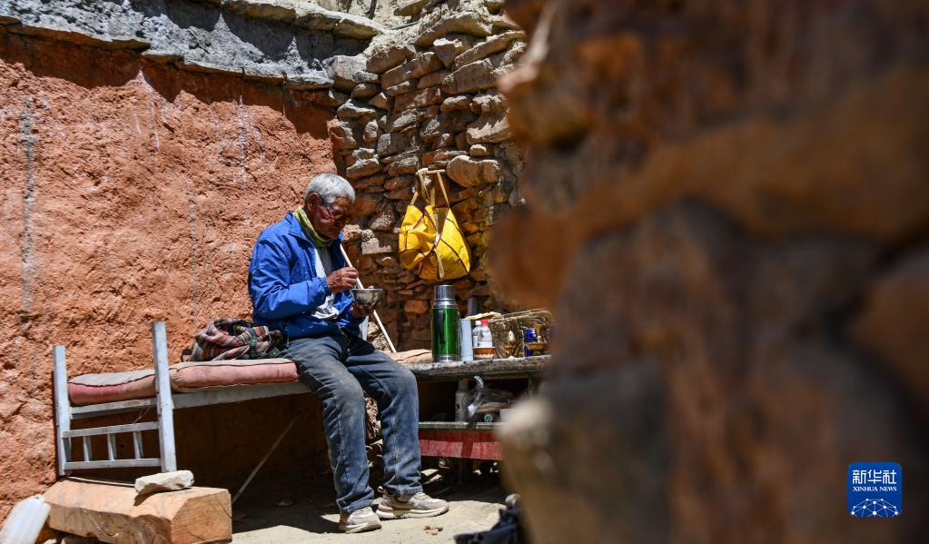 仁增旺紮老人在石窟旁吃午飯(5月26日攝)。新華社記者 晉美多吉 攝