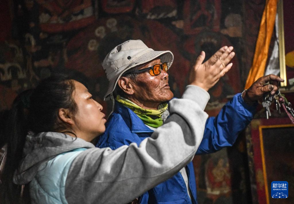 皮央和東(dong) 嘎石窟遺址文保員仁增旺紮老人給遊客講解壁畫(5月26日攝)。新華社記者 晉美多吉 攝
