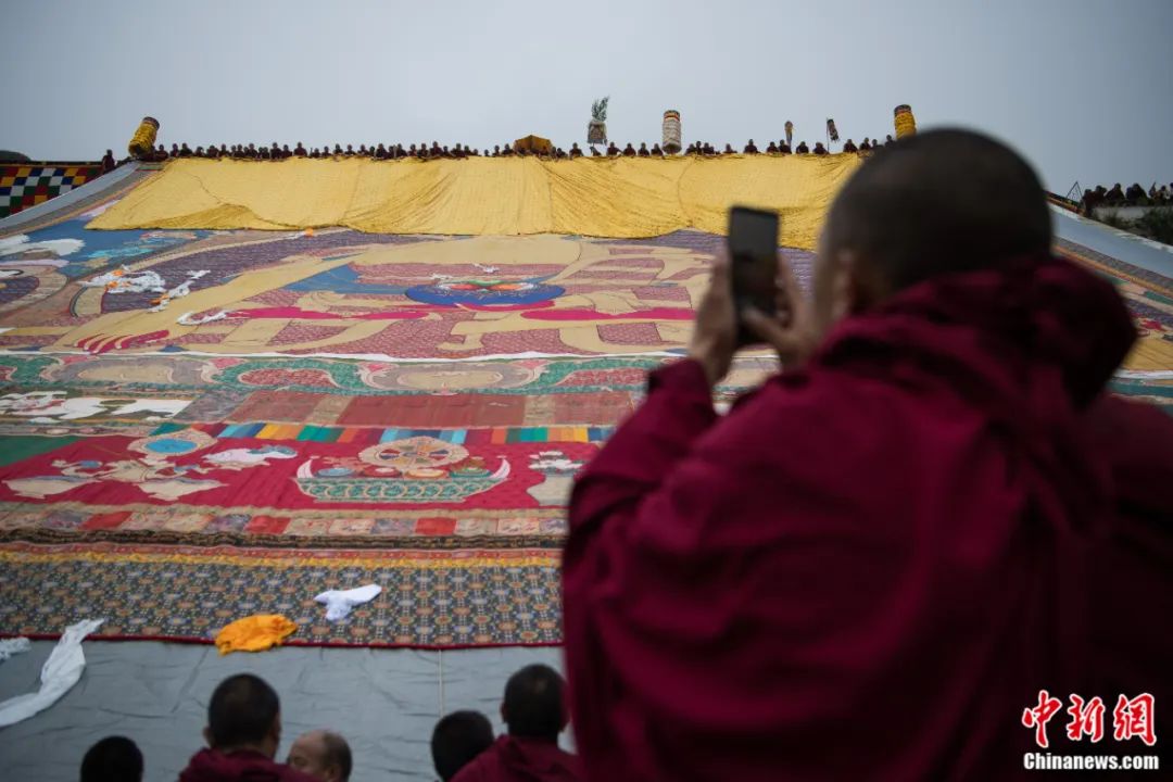 西藏拉薩哲蚌寺舉(ju) 行展佛活動,僧人用手機記錄。何蓬磊 攝