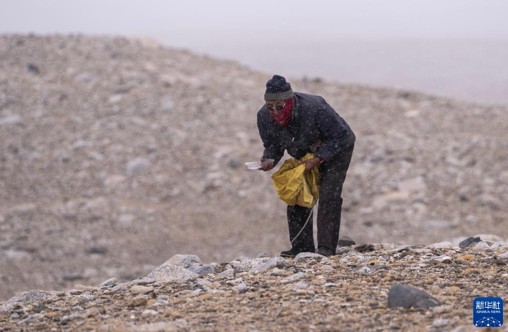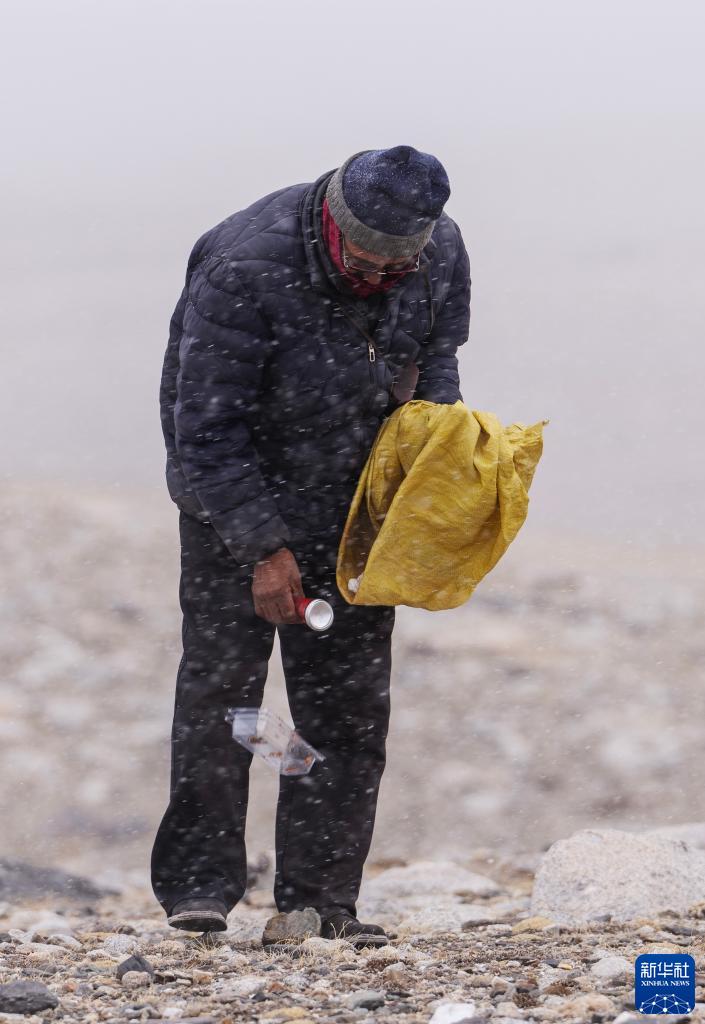 5月31日,乃乃老人在傑瑪央宗冰川山口附近撿拾垃圾。新華社記者 邵澤東(dong) 攝
