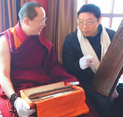 項目總顧問丁真俄色(左)與(yu) 西藏自治區古籍保護中心研究館員、古籍專(zhuan) 家白張探討古籍保護。