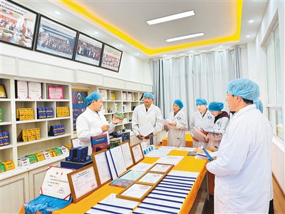 平措饒吉(左一)在介紹作為(wei) 項目成果轉化的藏醫藥品。