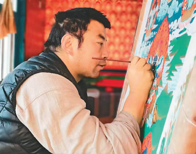 象雄唐卡畫家嘎鬆旺加在繪畫唐卡。據介紹,唐卡畫風的傳(chuan) 承最早可追溯到古象雄時期,其佛像繪製主要依據了《古象雄大藏經》中的度量法。