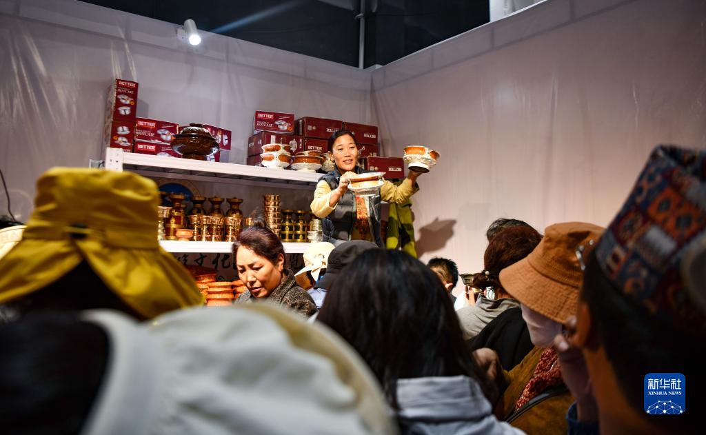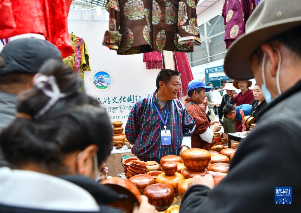 展會(hui) 上的不丹商人向顧客銷售不丹服裝和木碗(6月18日攝)。新華社記者 晉美多吉 攝