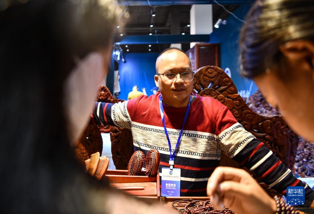 藏博會(hui) 越南展位上的商人在銷售越南特色商品(6月18日攝)。新華社記者 晉美多吉 攝