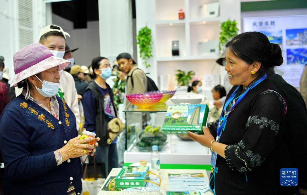 在藏博會(hui) 上,來自西藏昌都市的參展商(左)向顧客推介產(chan) 品(6月17日攝)。新華社記者 張汝鋒 攝