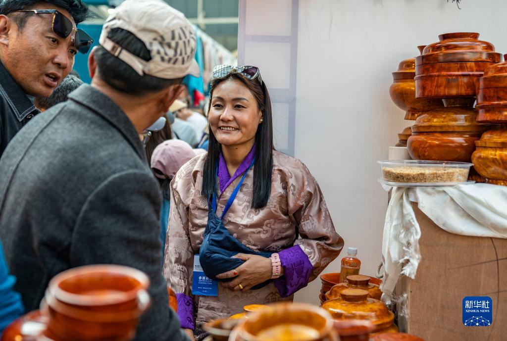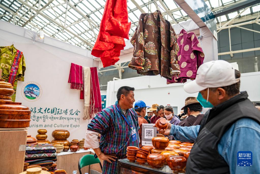 在第五屆藏博會(hui) 現場,來自不丹的參展商旺楚克·澤帕(左一)跟顧客交談(6月18日攝)。新華社記者 孫非 攝