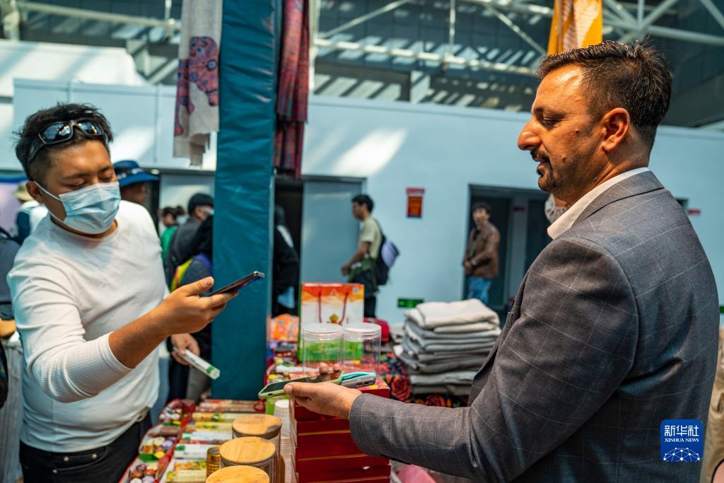 在第五屆藏博會(hui) 現場,來自印度的參展商伊納亞(ya) 特·艾哈邁德·汗(右)使用二維碼收款(6月17日攝)。新華社記者 孫非 攝