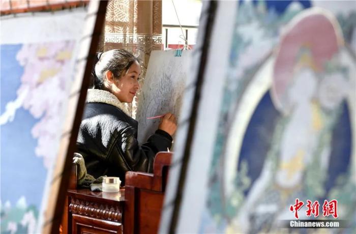 索朗次旺在西藏拉薩繪製唐卡。隨著社會(hui) 的發展,越來越多的西藏女性學習(xi) 唐卡繪畫。李林 攝