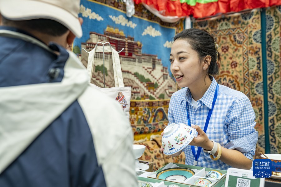 在第五屆“藏博會(hui) ”現場,工作人員向顧客介紹產(chan) 品(6月18日攝)。新華社記者 孫非 攝