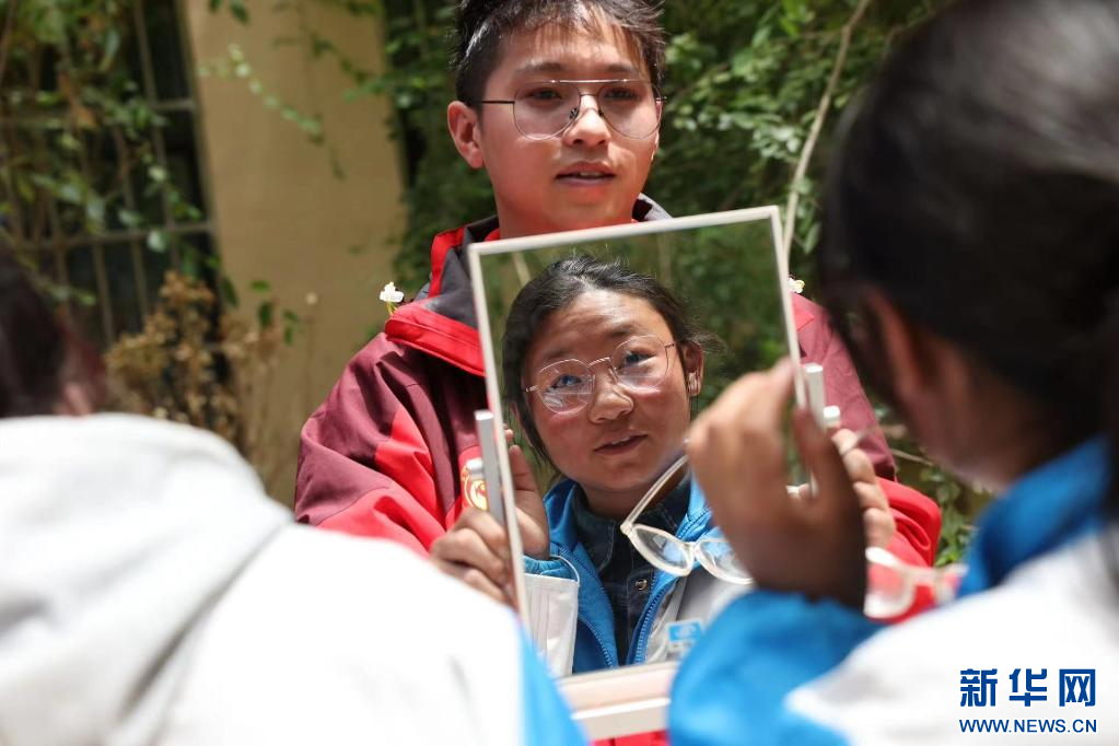 在西藏自治區那曲市色尼區第二中學(杭嘉中學),誌願者狄璐琬正引導戴上試戴架的學生適應眼鏡清晰度(6月22日攝)。新華社發(趙穎碩 攝)