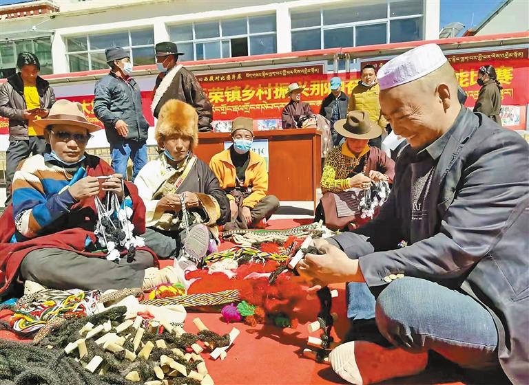 這是在那曲市聶榮縣聶榮鎮“鄉(xiang) 村振興(xing) 那曲奮進”活動中,藏族群眾(zhong) 和回族群眾(zhong) 在交流手工藝品的製作方法。