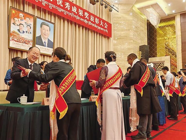 記者從(cong) 表彰大會(hui) 上了解到,2021年10月12日,自治區政府辦公廳印發了《西藏自治區哲學社會(hui) 科學優(you) 秀成果獎勵辦法》。《辦法》規定,西藏自治區哲學社會(hui) 科學優(you) 秀成果獎是由自治區人民政府頒發的全區哲學社會(hui) 科學研究領域最高獎項,評獎工作每兩(liang) 年開展一次;獎項分為(wei) 著作類、論文類、報告類,分別設一等獎、二等獎、三等獎。對推動學科體(ti) 係、學術體(ti) 係、話語體(ti) 係建設有突出貢獻的成果,設特等獎。
